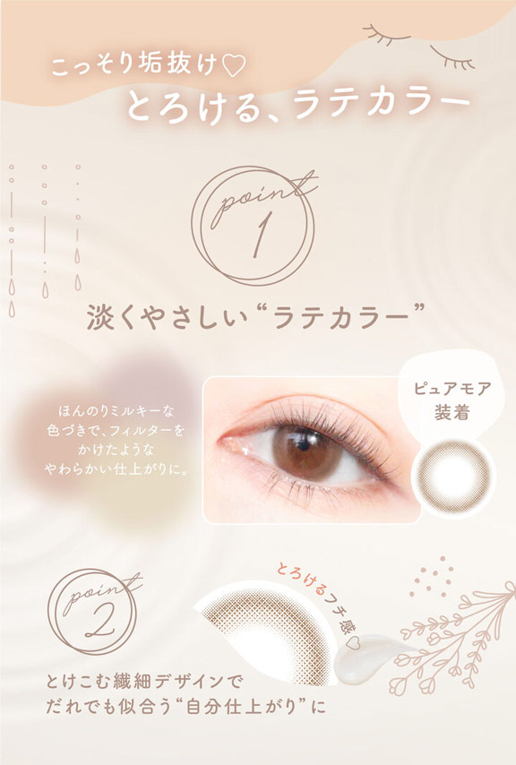 ピュアモア は、もっとやわらかくもっとやさしく瞳にとろける。あたたかみのあるブラウンカラーでピュアMAXなカラコン